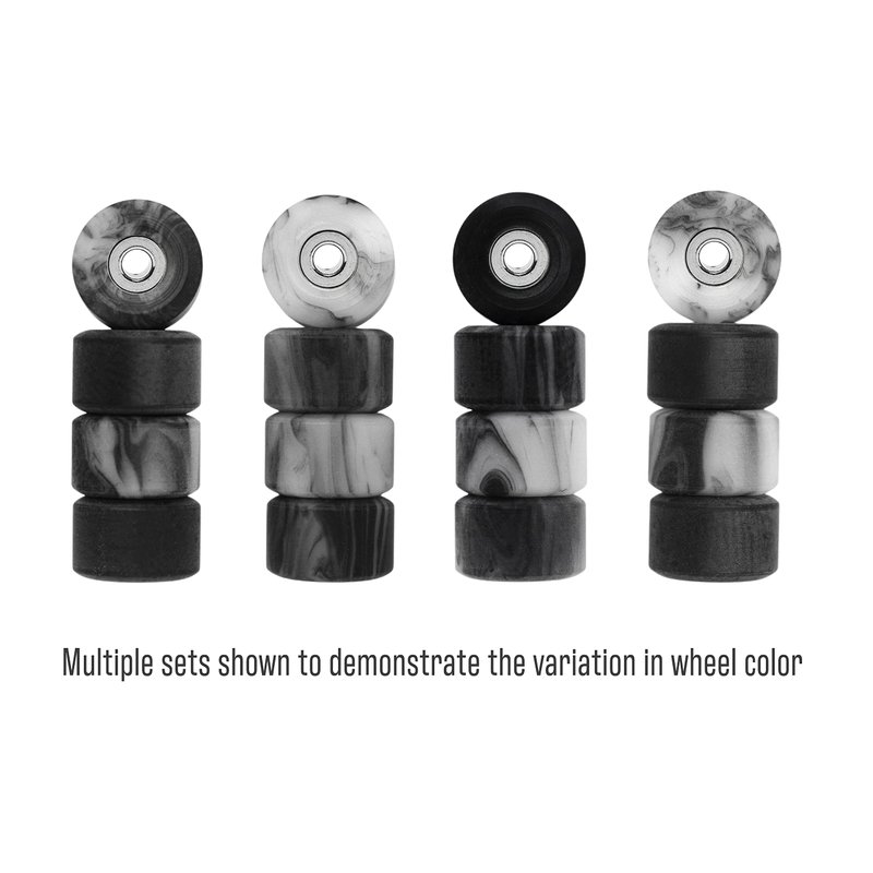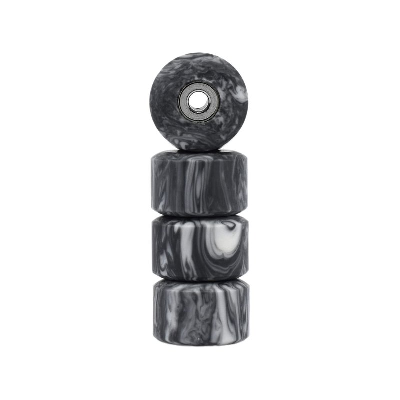 Set of four Apex Series, New Street Style Fingerboard Wheels in "Grey & White Swirl" Colorway. The New Street Style 61D wheels are our softest wheels yet, and are equivalent to 101A hardness. The feel of these wheels are very similar to real skateboard wheels. Measuring 7.7mm in diameter and 4.9mm wide, these wheels are great for easy riding and doing tricks on all kinds of surfaces. These wheels are designed and made in the USA using a premium quality, custom Teak blended urethane. Each wheel is casted and cut in New York. Colors are handmixed and may vary slightly between sets. Many fingerboarders love the squeak sound that urethane wheels make as you powerslide across a surface or do a sharp turn.
