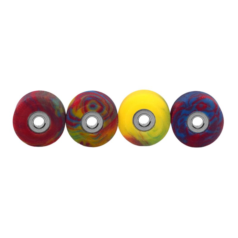 Set of four Apex Series, New Street Style Fingerboard Wheels in "Tie Dye Swirl" Colorway. The New Street Style 61D wheels are our softest wheels yet, and are equivalent to 101A hardness. The feel of these wheels are very similar to real skateboard wheels. Measuring 7.7mm in diameter and 4.9mm wide, these wheels are great for easy riding and doing tricks on all kinds of surfaces. These wheels are designed and made in the USA using a premium quality, custom Teak blended urethane. Each wheel is casted and cut in New York. Colors are handmixed and may vary slightly between sets. Many fingerboarders love the squeak sound that urethane wheels make as you powerslide across a surface or do a sharp turn.