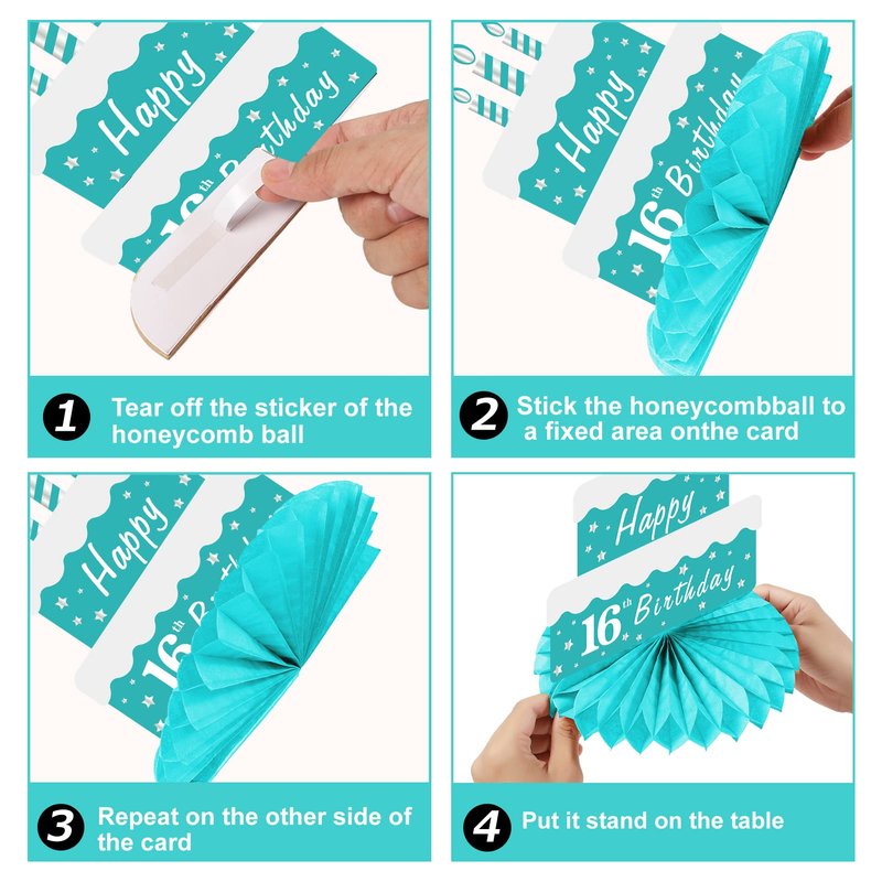 8pcs Happy 16th Birthday Decorations Honeycomb Centerpieces Material: paper Color: Teal Silver Count: 8 Pcs Occasion: Suitable for your 16 birthday parties. Easy to use: There are fixed sticker position under the two side of pattern cardboard. First tear off the sticker of the honeycomb, then open the honeycomb, finally paste honeycomb together with the cardboard. Package included: 8 x pattern cardstock 8 x complete honeycomb ball