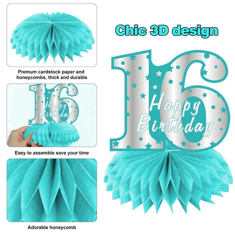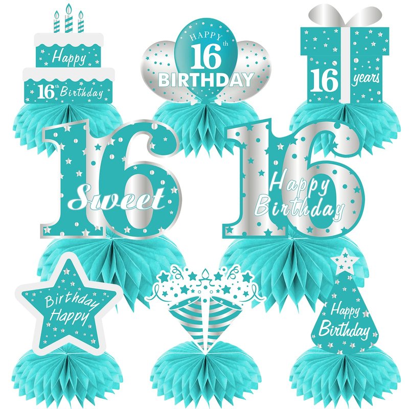 - [Exquisite Design] - This happy 16 birthday honeycomb party supplies are in teal and silver as the main color, with a variety of birthday party pattern designs, such as gift boxes, balloons, fireworks, cakes, etc. Great table centerpiece decorations.