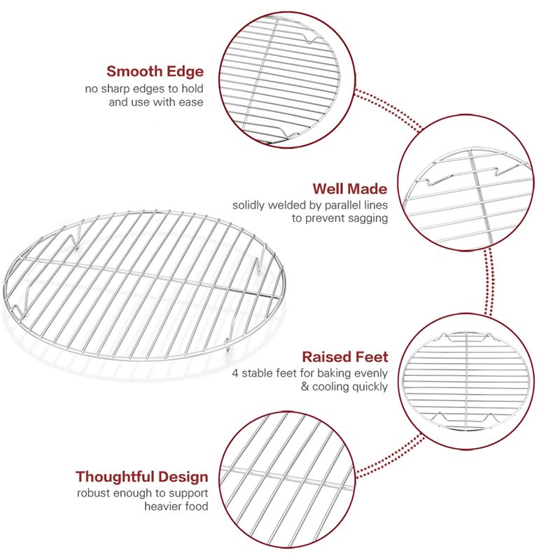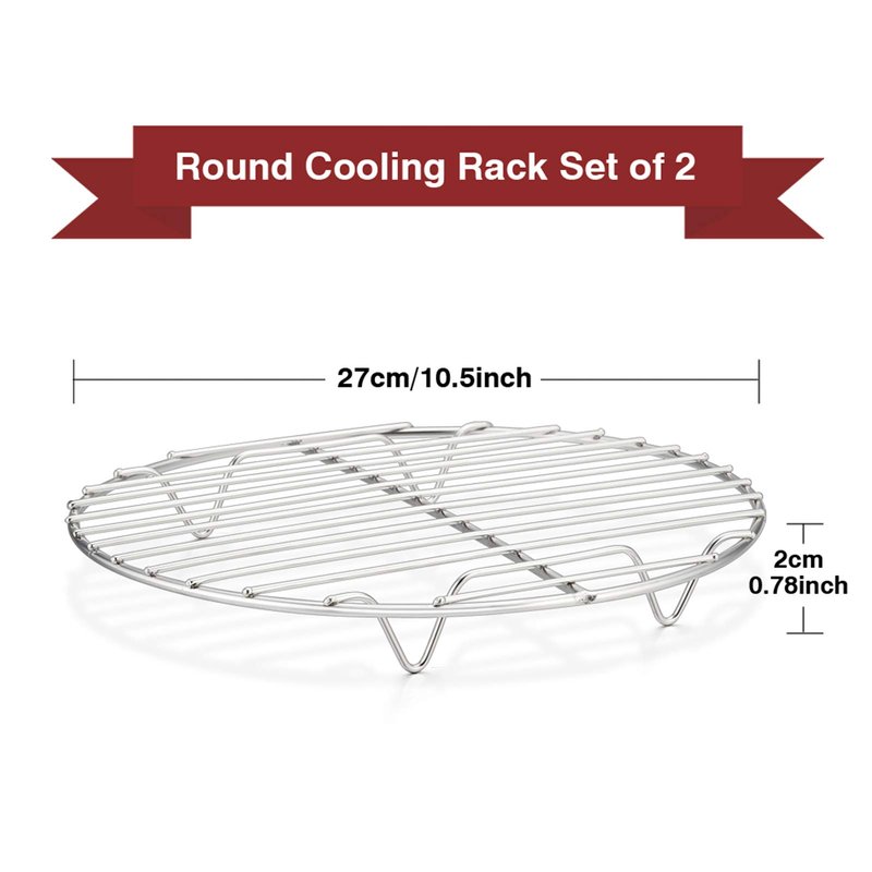 TeamFar 10.5 Inch Round Cooling Rack Set of 2, are made of pure stainless steel, no aluminum and toxic chemical substance into your food. They are healthy and safe for cooling/baking/steaming. High resistance to rust and durable for long-life serving. They are also fit for toaster oven and TeamFar round cake pan. 4 raised feet provide stability and the dense wire easy to hold the food. Our round baking cooling rack is oven and dishwasher-safe, and super-easy clean-up easily by hand-wash.