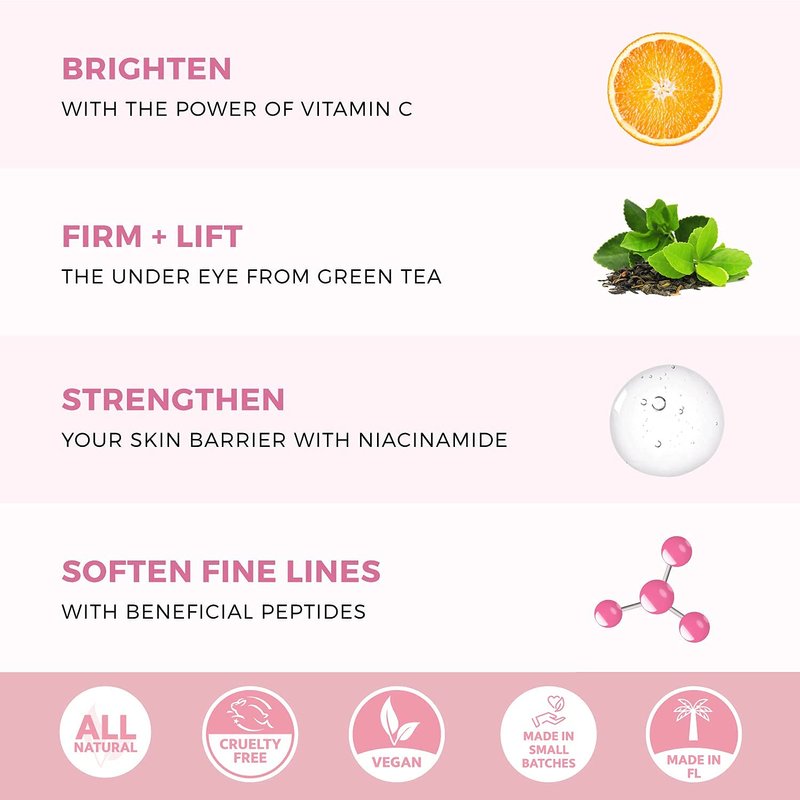 - Get a Natural Glow With Healthy Ingredients: Formulated with enriching ingredients like vitamin C which is rich in antioxidants, bursting with hydrating and protective benefits for the skin making a clean caffeine eye cream from green tea that helps reduce puffiness and supports the appearance of firm and lifted skin, paired with the power of niacinamide which will soften fine lines & wrinkles while improving the skin’s barrier & peptides supporting production of natural collagen in the skin.