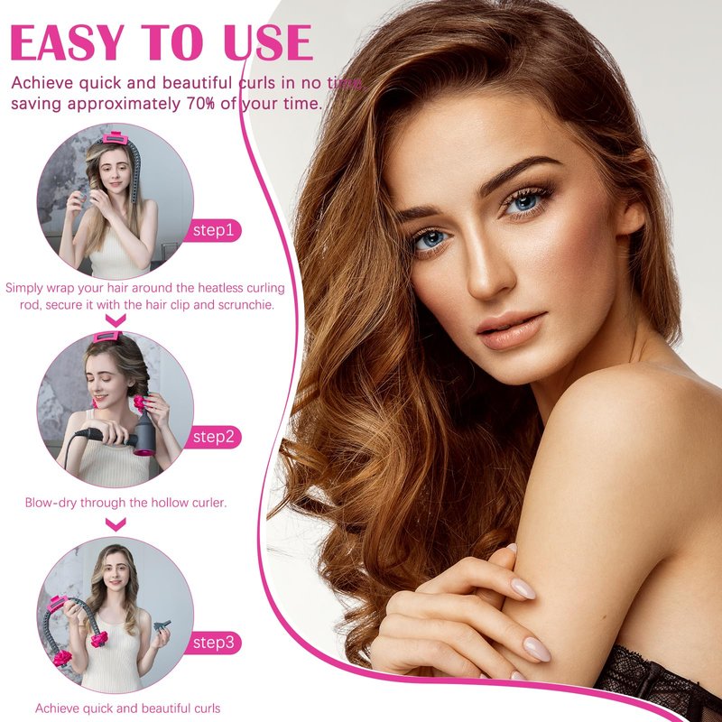 - Easy to Use: Simply wrap your hair around the heatless curling rod, secure it with the hair clip and scrunchie, then blow-dry through the hollow curler. You'll achieve quick and beautiful curls in no time, saving approximately 70% of your time.