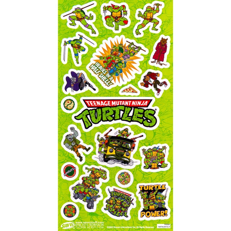 - Colorful Nickelodeon TMNT and Teenage Mutant Ninja Turtles stickers featuring the Ninja Turtles characters and phrases.