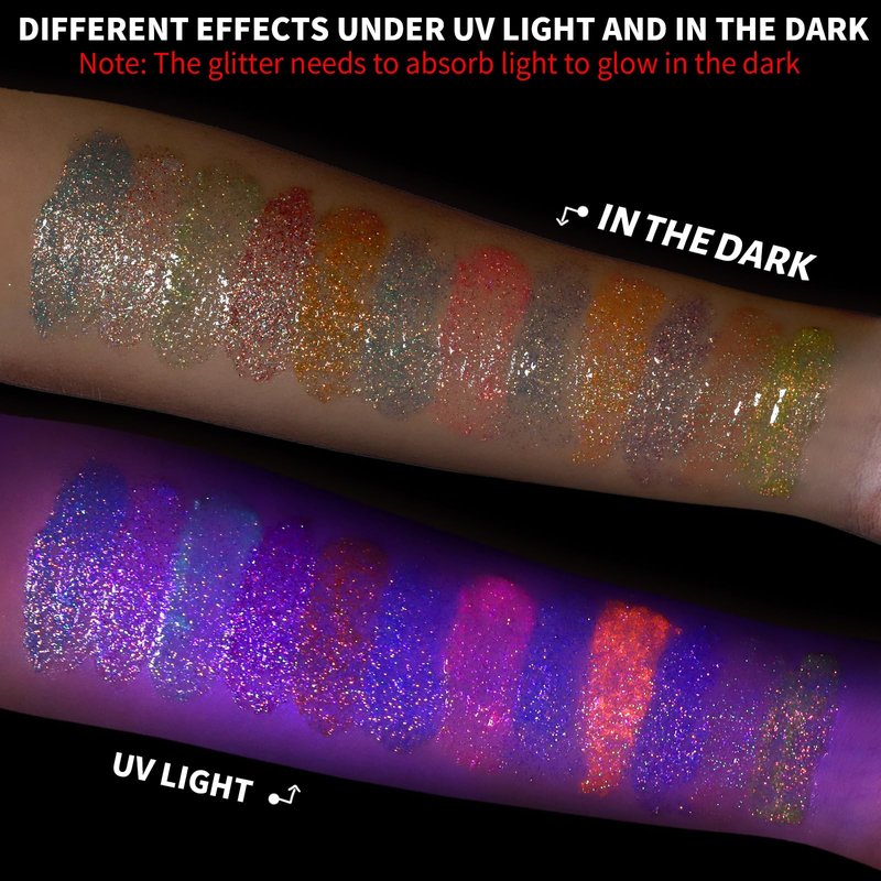 - Radiant UV Reactive Glam: Experience stunning luminosity under UV light with Teenitor face sparkles. Remember to charge it in light for an extraordinary glow in the dark effect, amplifying your beauty with every radiant sparkle