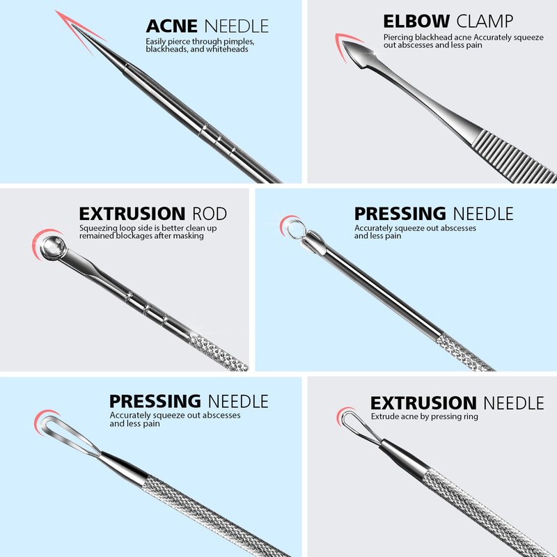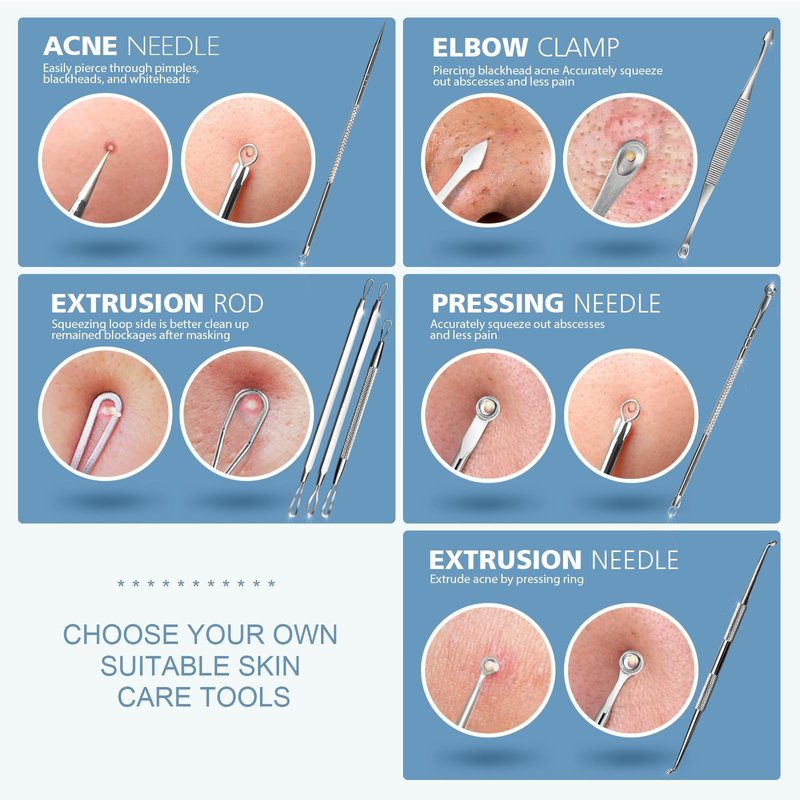 - BLACKHEAD EXTRACTOR: it shall leave less of scars compared to the normal way of using your fingers. you can safely remove the annoying pimples and avoid infection by following the follow instruction: (please choose the MATURED acne pore, otherwise it wil get worse) firstly hold the warm cloth to the area to open up the pores, then use alchol to wipe your pore area and the tools before/during and after, lastly apply toner to your skin