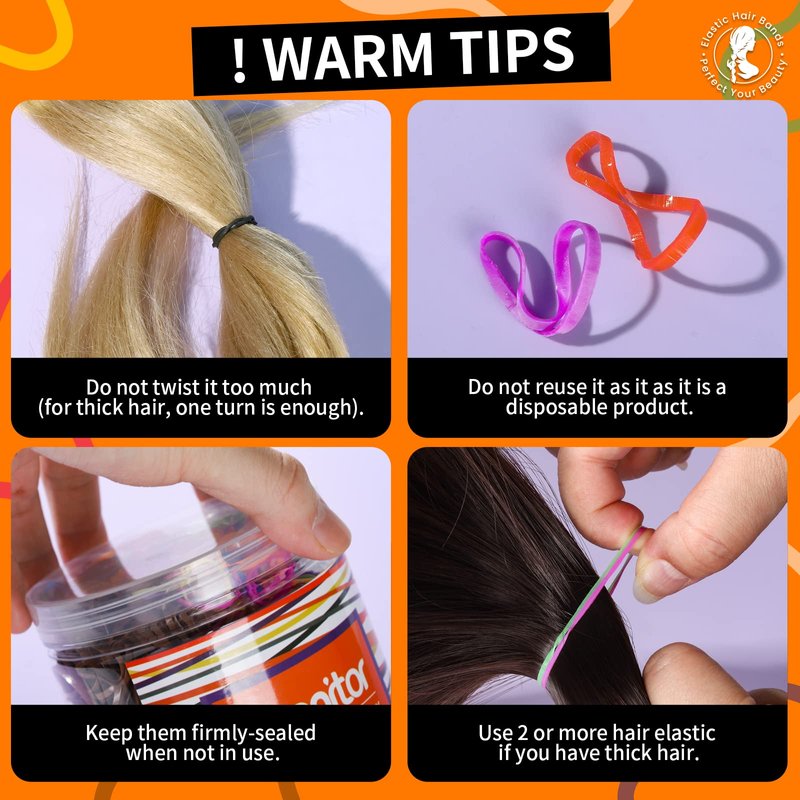 - WARM TIPS: These rubber bands are disposable, if reused, they will become a little bigger each time, please do not reuse once the elastic band is loosened. You can choose the appropriate number at a time according to the thickness and tightness requirements of your hair; please keep them out of reach of children under 3 years old to avoid choking and swallowing.