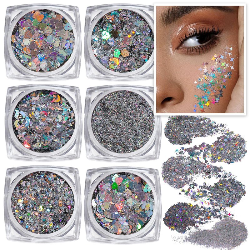 - SPARKLY BODY GLITTER GEL: Teenitor silver holographic body glitter set is absolutely stunning. The variety of shapes – stars and moons, starbursts, hearts – along with the different sizes of glitter offer endless possibilities for creating unique and dazzling looks. These came nicely packaged, sealed, and with multiple applicators