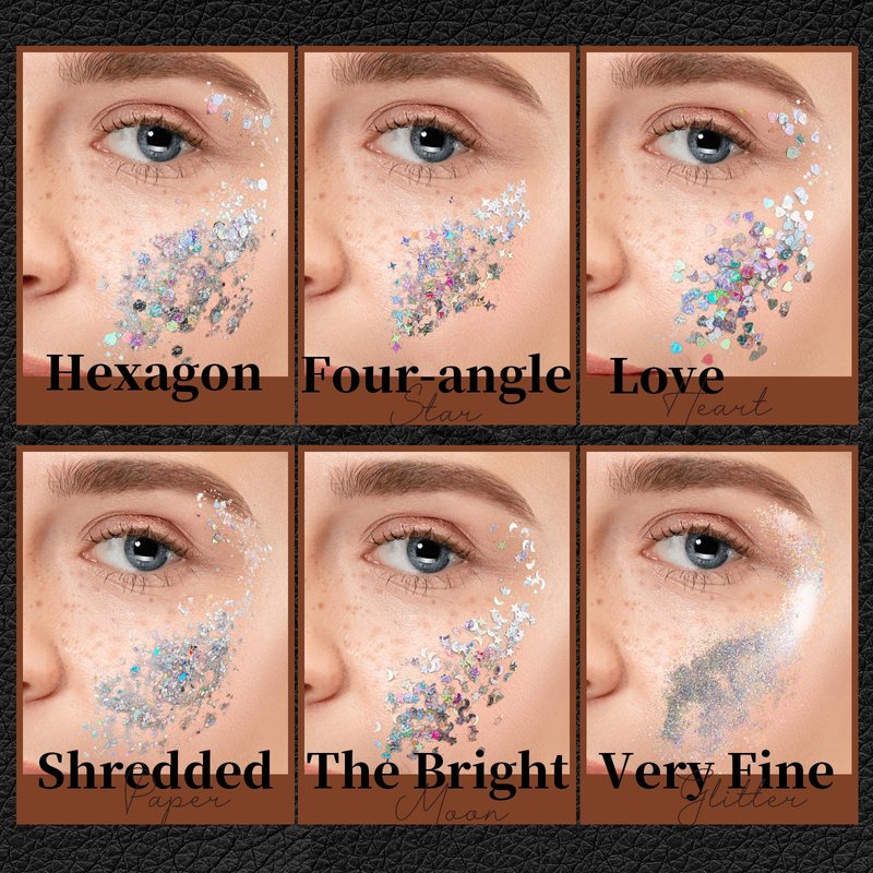 - IDEAL AS FESTIVAL GLITTER: All different shapes and styles of glitter. The silver shades are all super shiny and metallic reflecting. The glitter is easy to apply and can be used for both body glitter and hair. this glitter is clear gel, vs any color. Lightweight and not bothersome