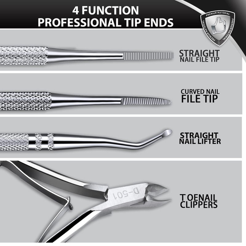 Ingrown toenail Tools, the tool is effective in dislodging ingrown toenails and helping to file down sharp nail edges that normal sized files can't reach. The set includes different sizes and curves of tools that are easy to use and sturdy