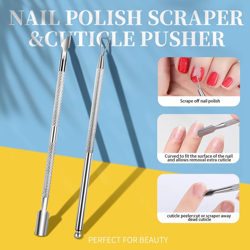 - CUTICLE PEELER SCRAPER AND PUSHER: High quality and strudy polished stainless steel for long-term use, smooth edges. The cuticle pusher is curved to fit the surface of the nail and allows removal of nail polish without pulling or tugging. No damage to nail.