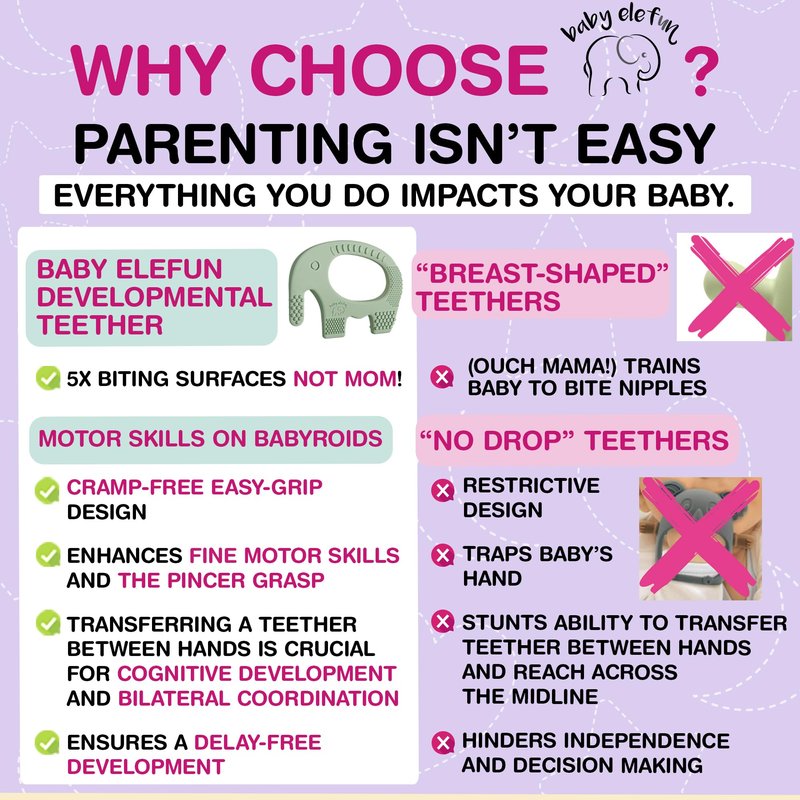 - 5X smart pain relief surfaces = mom’s not a chew toy: while other teethers for babies 6-12 months train growing baby that mom’s nipples are a chew toy - Ouch! - Elefun Pacifies baby into bliss, with 5 strategically designed teething surfaces that keep baby interested in chomping on their Best Little EleFriend and not on their parents poor hands. Nom. Nom. nom. Blisssss.