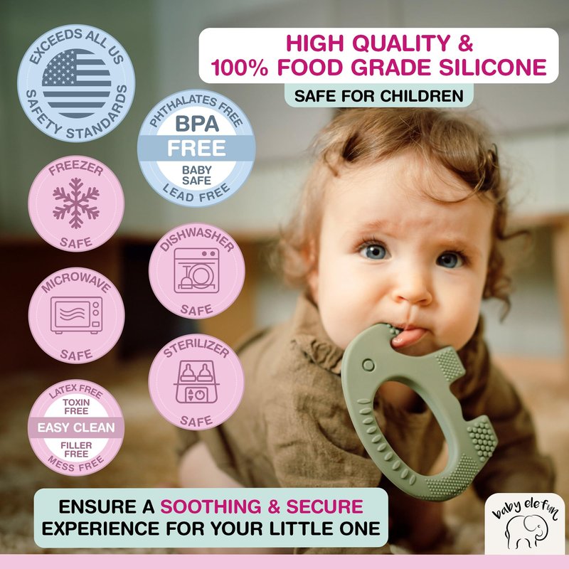 𝗘𝗳𝗳𝗲𝗰𝘁𝗶𝘃𝗲 𝗧𝗲𝗲𝘁𝗵𝗶𝗻𝗴 𝗥𝗲𝗹𝗶𝗲𝗳 - Baby Elefun teething toy is designed to provide 5 times the pain relief for teething babies, offering a soothing solution to alleviate discomfort and make baby teething more manageable. 𝗭𝗲𝗿𝗼 𝗗𝗲𝘃𝗲𝗹𝗼𝗽𝗺𝗲𝗻𝘁𝗮𝗹 𝗗𝗲𝗹𝗮𝘆 - Our smart baby sensory toys ensures zero developmental delay, promoting healthy oral and motor skills development in babies aged 6 to 12 months. Support your little one's growth with these thoughtfully crafted teething rings. 𝗦𝗮𝗳𝗲 𝗮𝗻𝗱 𝗚𝗲𝗻𝘁𝗹𝗲 - Crafted from high-quality silicone, this baby teether is safe for your baby to chew on. These silicone teethers for babies are non-toxic and BPA, latex, lead and phthalates free, and offer a gentle and comforting teething experience without compromising on safety. 𝗩𝗲𝗿𝘀𝗮𝘁𝗶𝗹𝗲 𝗨𝘀𝗲 - Our baby teething toy is not just adorable, it's also practical! Microwave and freezer safe, it offers versatile options for soothing your baby's gums. Pop it in the freezer for a cooling effect or warm it up for a comforting teething experience. 𝗤𝘂𝗮𝗹𝗶𝘁𝘆 𝗔𝘀𝘀𝘂𝗿𝗮𝗻𝗰𝗲 - Our teether toy undergoes rigorous quality checks to ensure it meets the highest standards of safety and durability. If for any reason you're not happy with the Baby Elefun Baby Teethers, our customer support team is ready to assist you. We stand behind our product and are committed to ensuring your experience is positive.