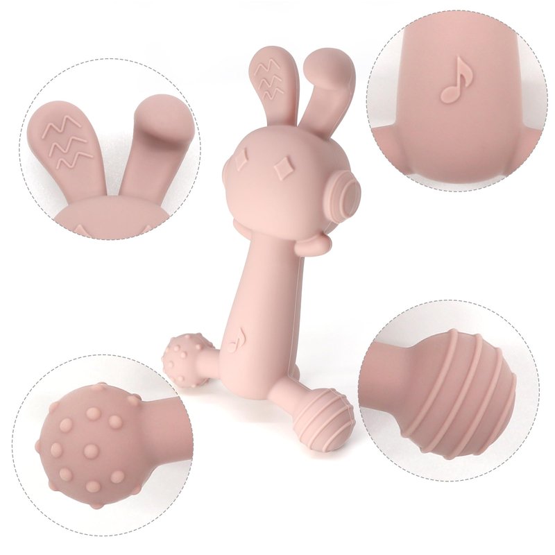This baby teething toy is made of soft silicone, which is safe and non-toxic for babies to chew on. It has a cute rabbit shape and a variety of textures to help soothe baby's gums during teething. The rabbit toy is also designed to be easy to grip and hold, making it ideal for babies who are just starting to learn to grip and hold objects. The teething toy is also BPA-free, making it safe for babies to put in their mouths. It is a great gift for babies who are teething or for babies who are just starting to explore the world with their mouths.