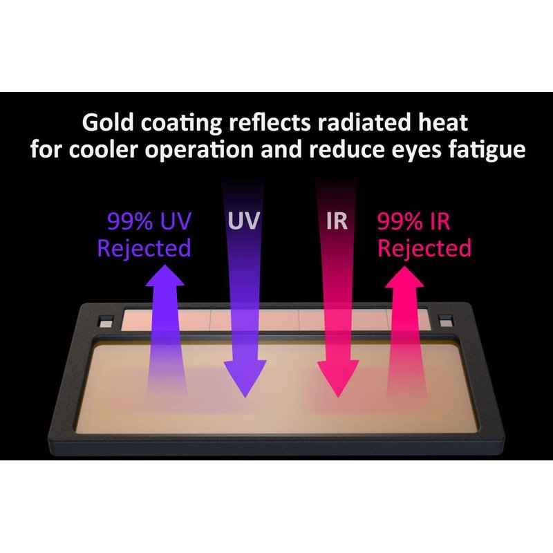 - Gold coating rejects 99% of UV&IR from welding arc, reflecting radiant heat for cooler operation and less eye strain.