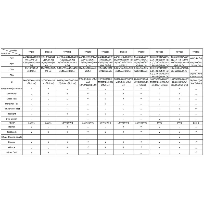 Please refer to the comparison chart in the image to choose your favorite meter from Tekpower, you will find the best one you need from Tekpower.