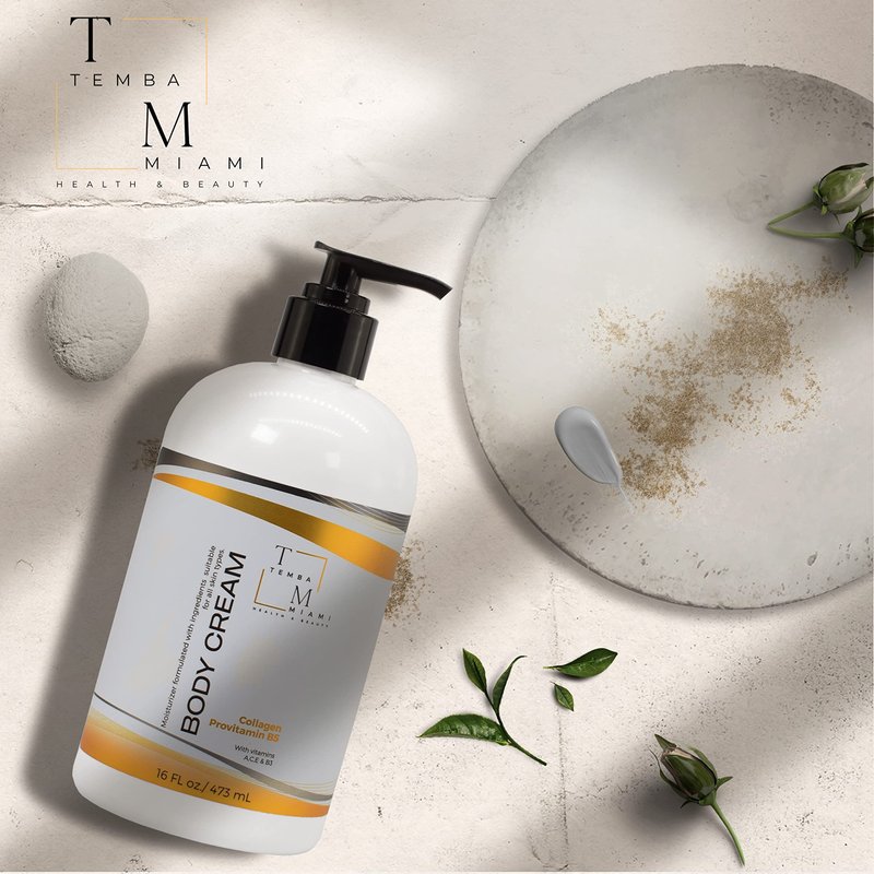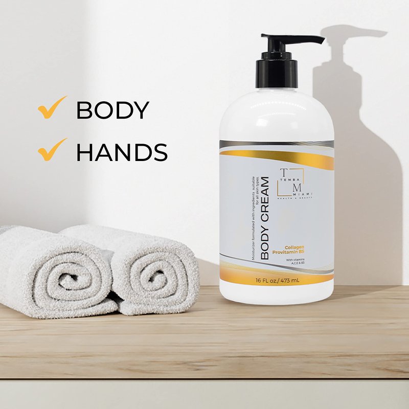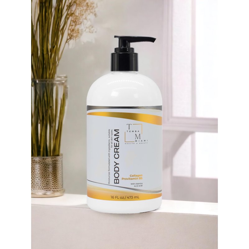 TEMBA MIAMI BODY & HAND CREAM Moisturizer, ANTI-AGING Body Cream, Non Greasy For ALL SKIN TYPES, With COLLAGEN & SHEA BUTTER, White, 16 Oz.