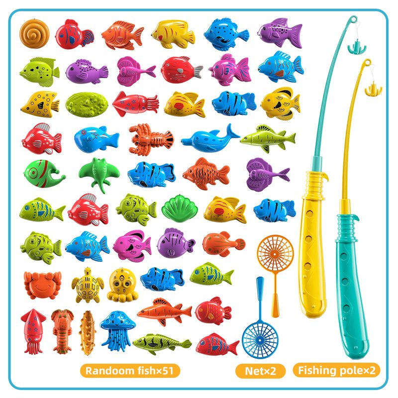 - Interesting Fishing Game Toys for Kids: Kids water toy includes 51 cue magnetic fish, 2 magnetic fishing poles (8.6 in) and 2 fishing nets (6.3*2.9 in). Baby and toddler toys are suitable for Kids over 3 years old.