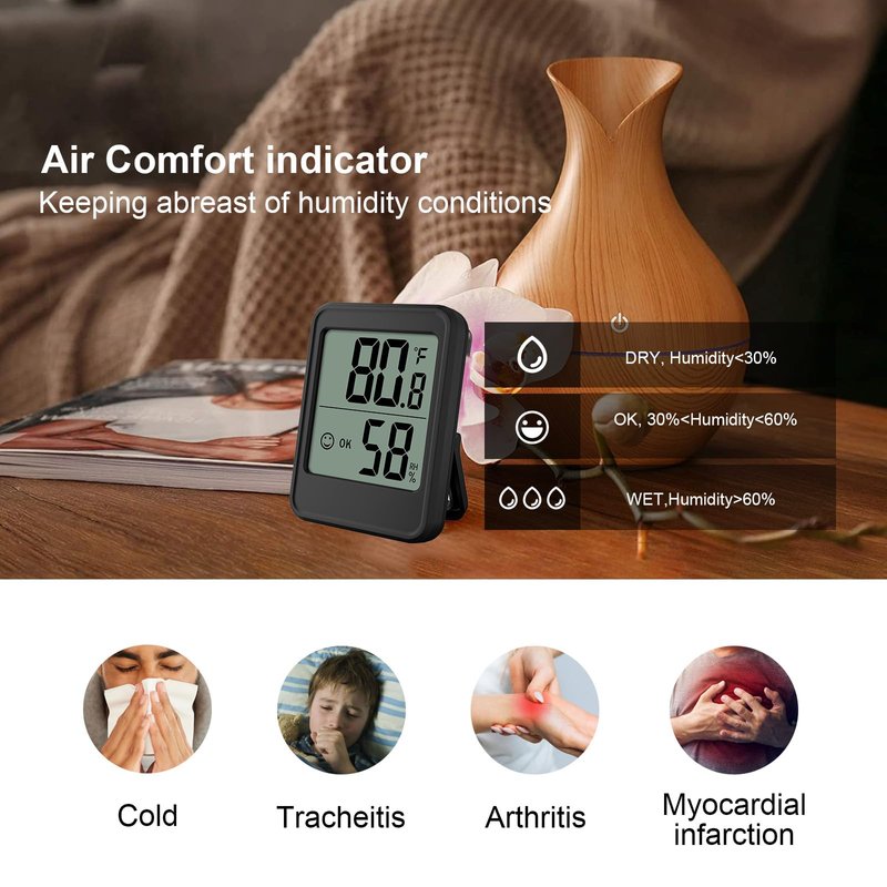 - Air Comfort Indicator: The digital hygrometer with humidity level icon indicates air condition for DRY-OK-WET, you can know the humidity condition of your home at a quick glance through the icon's indication.