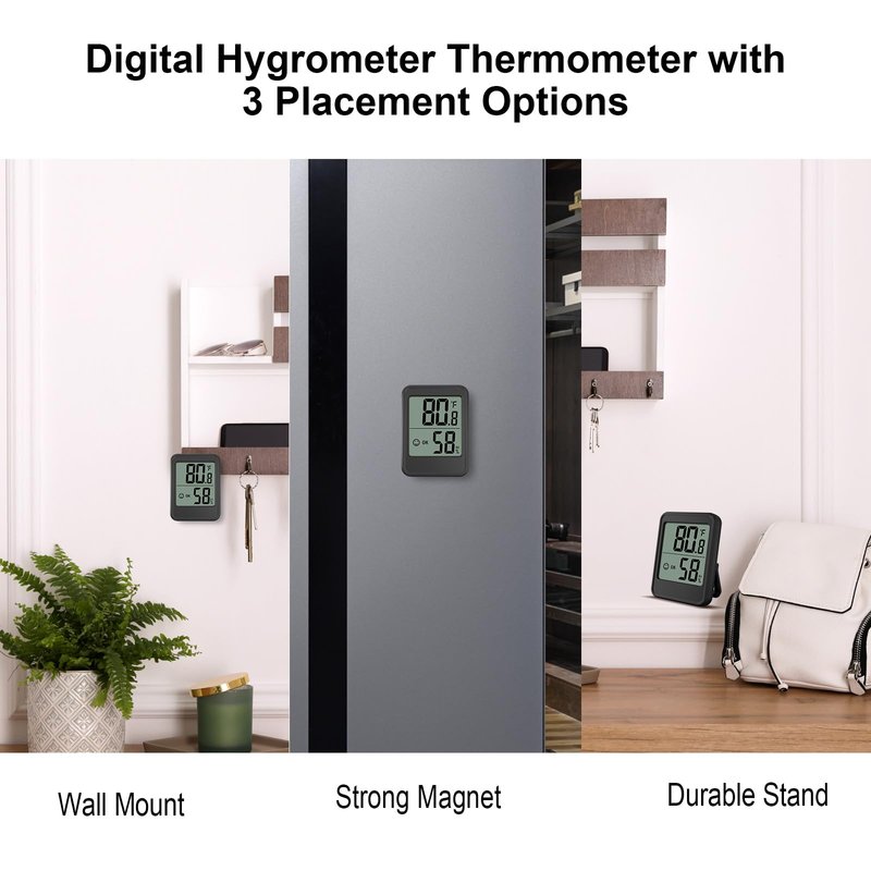- Easy to Use: This room thermometer indoor features a tabletop stand, a magnetic back and a wall mount, place the temperature humidity monitor on your counter, fridge or wall with hooks.