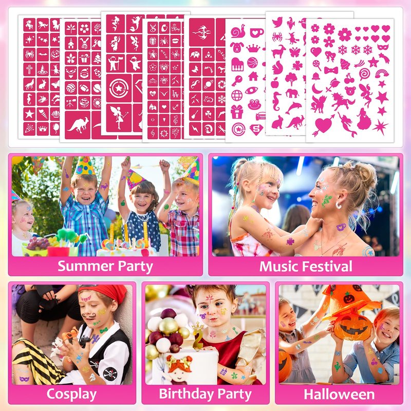 - The Perfect Gift for All Ages: Fun glitter tattoos will be a great surprise for everyone at parties, festivals, Halloween cosplay or other events. The glitter gel in the set can be used alone as makeup glitter for face, hair or eye shadow to add sparkle to your look. The beautiful gift box design makes it a great gift for girls and boys, whether it's Easter, Christmas, birthdays or any other occasion.