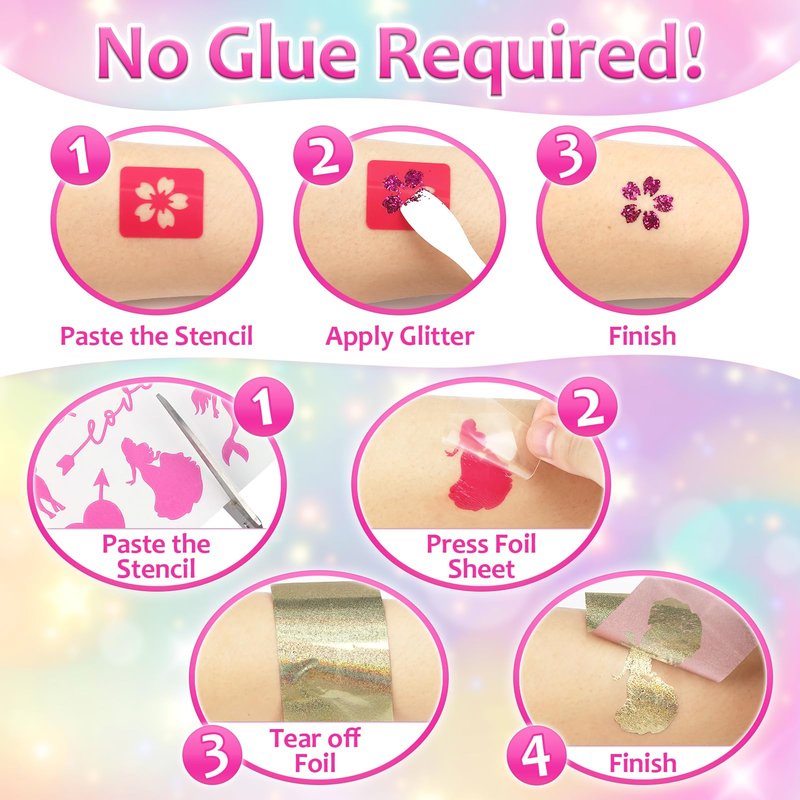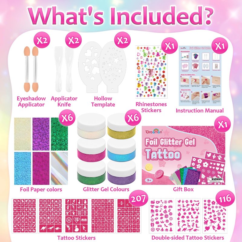 - All-in-one Sparkling Tattoo Kit: Our temporary tattoo kit contains 22 accessories, combines glitter tattoos and foil tattoos, allowing every kid to use their creativity to create crazy shiny tattoos. We also added a piece of sticky gemstone to embellish your tattoo and make it shiny brighter!