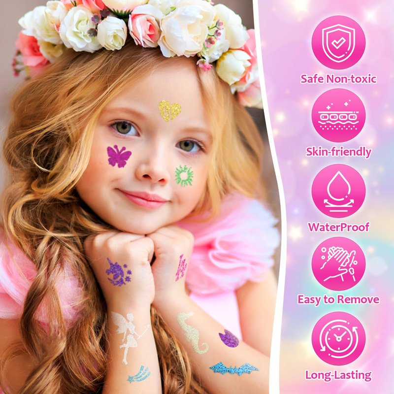 - Safe and Simple: Our glitter tattoos are specially designed for children, fully tested and safe to use on any part of the body. It is easy to apply and long lasting, usually lasting 3-7 days. If you change your mind, simply use soap and warm water to remove it. Tips: Sensitive skin and children under three years old should test before use.