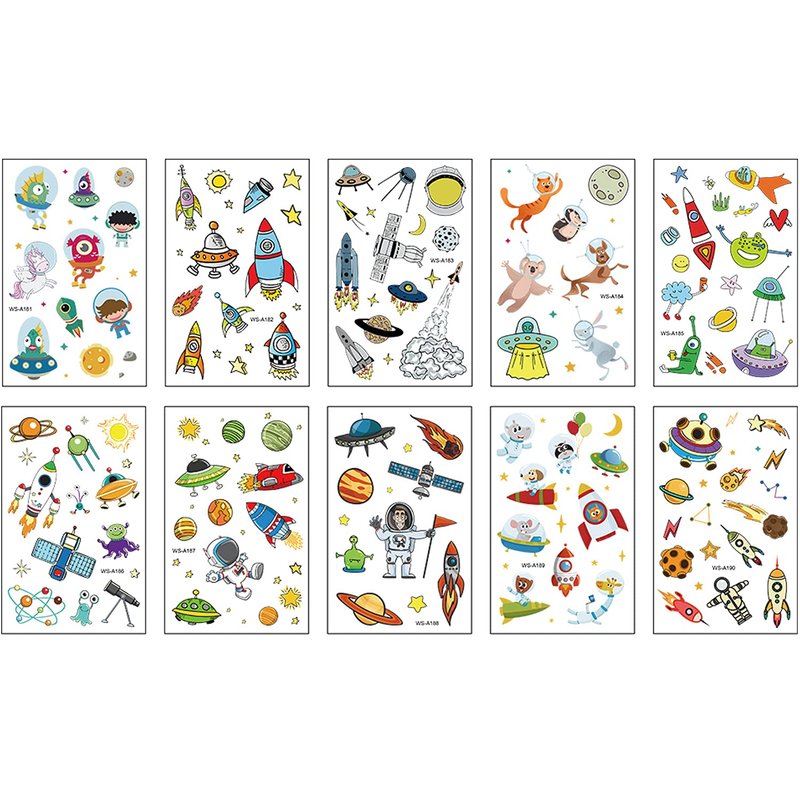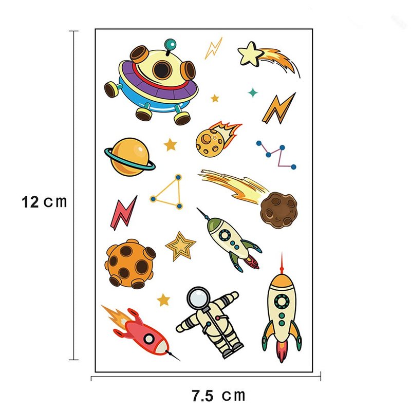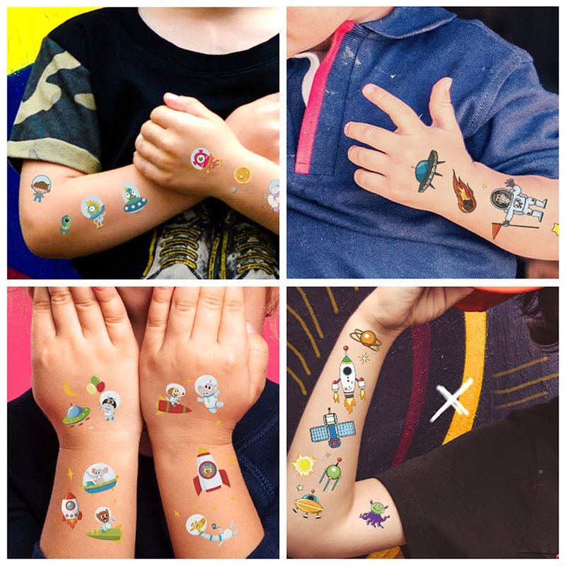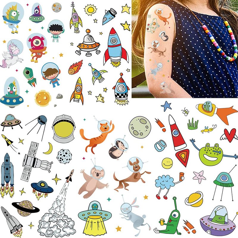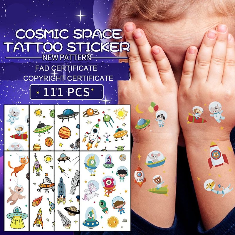 - Space Cartoon Tattoos Design - 10 Sheets 111pcs Cute Different Funny Space Style Cartoon Tattoos Stickers Pattern For Kids Boys Girls Women Men. Add Some Elements Of Interest Cartoon. Be unique to the party and help your kids share these tattoos with their friends.Mixed style tattoo stickers set are very fun for children. You can apply them to your body or some smooth objects, for example, glass, tile, stationery, paper, stainless steel, plastic, present box, mobile phone shell, car