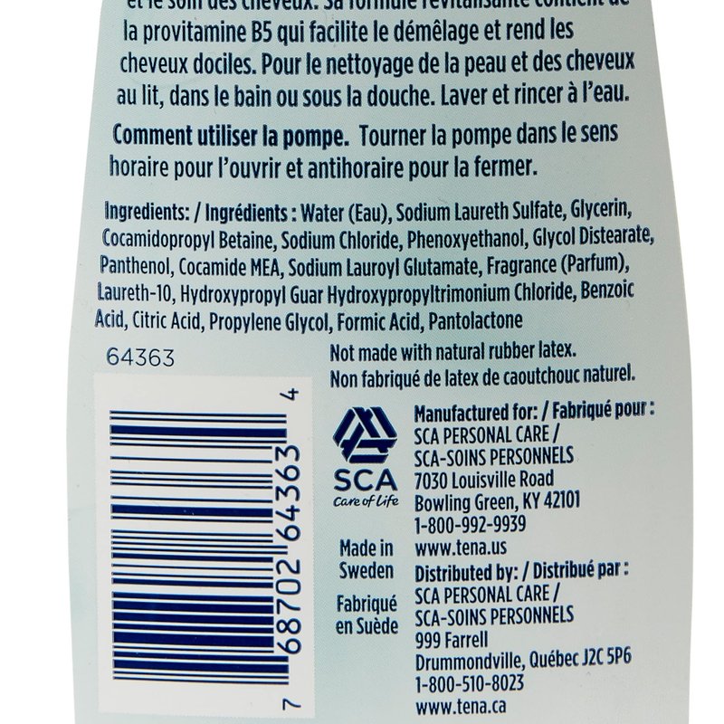 Clean and condition your hair and skin with this dual-purpose Tena Body Wash Gel and Shampoo. The mild formula provides gentle cleansing to maintain fragile skin integrity, and it leaves hair soft and smooth. Tena body wash and shampoo is anti-static, and contains provitamin B5 to help detangle hair and leave it easier to comb. The 2-in-1 shampoo and body wash is lightly scented to leave your skin smelling fresh, moisturized and clean. It comes in a pump bottle that's quick and easy to use. - Tena body wash and shampoo has a mild formula that doesn't irritate fragile, sensitive skin. It contains provitamin B5, which helps condition hair and leaves it static-free and easy to comb. The formula's gentle cleansing maintains skin integrity during a full bath. The scented body wash gives the skin a refreshing smell. The handy pump bottle is easy to use .