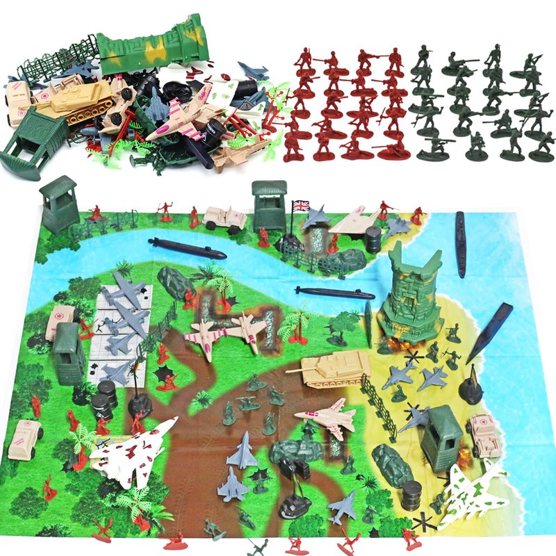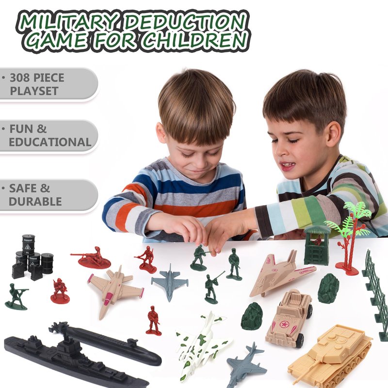 - 【Military Kit】This set of 308 plastic military toys includes a battle map simulation. Package all kinds of toys soldiers, army tanks toys and cars, army helicopters and fighter jets, including a variety of ships. More equipped with a variety of terrain buildings, simulate the most realistic scenes, more diverse gameplay.