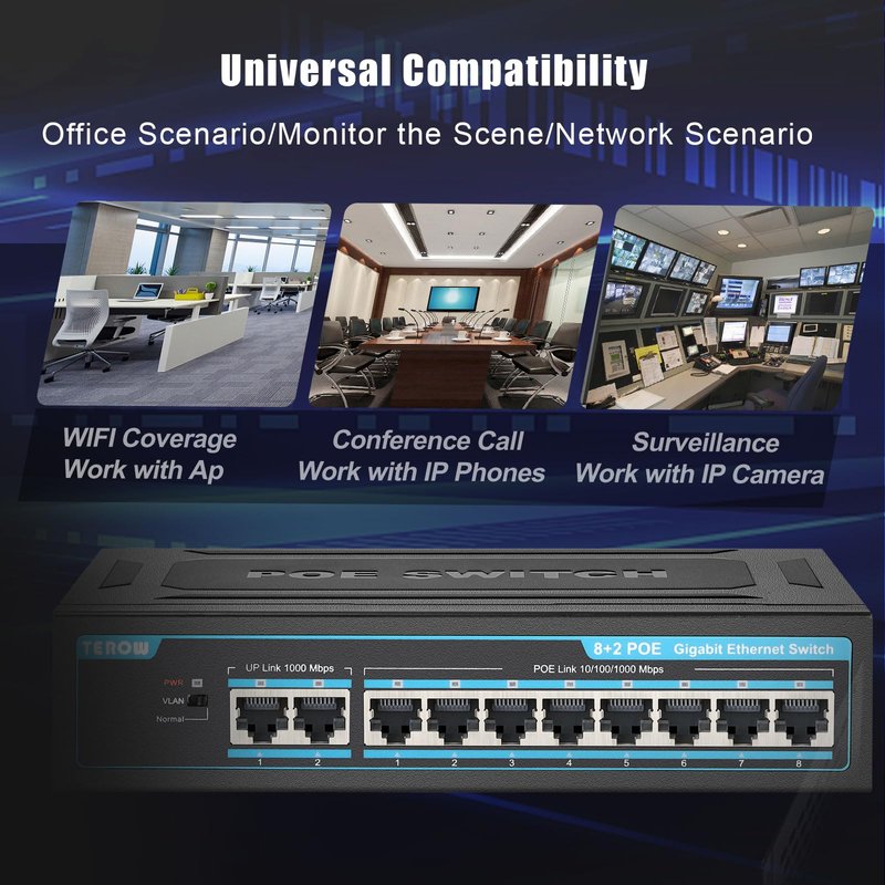 - Ultra-Fast Gigabit Ethernet Switch: Enhance your internet speed with Terow's Gigabit PoE Switch, equipped with 8 Gigabit RJ45 Ports and 2 Uplink Ports. Experience a seamless connection with speeds up to 1,000Mbps