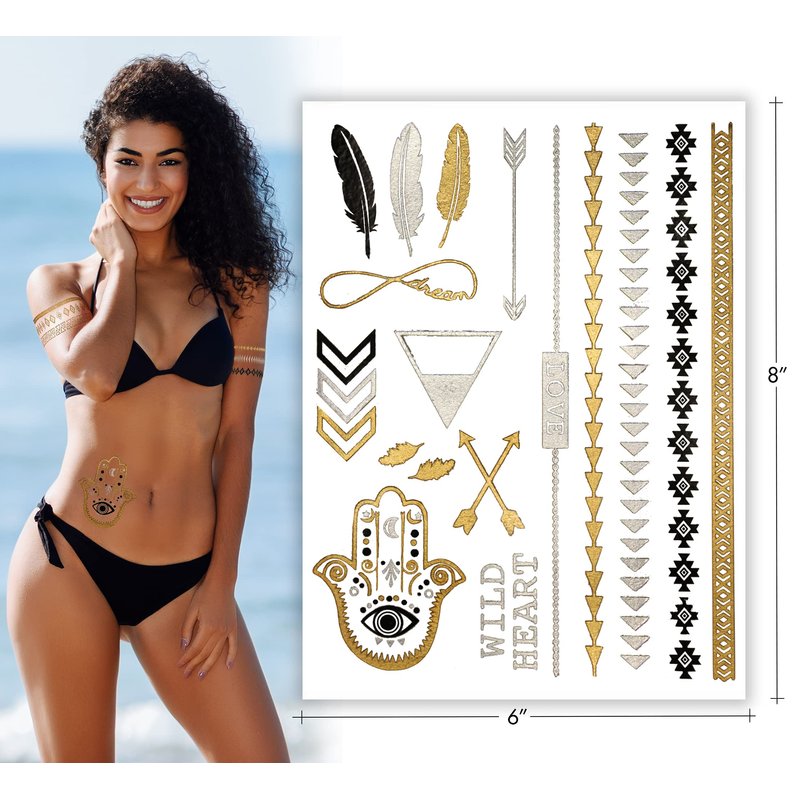 - Tons of Designs: Over 75+ tribal tattoo temporary gold metallic designs that match the vibrant images shown. Tattoo stickers for women are perfect for festivals, concerts, vacation or a simple way to get creative with your look! Designs include feathers, arrows, birds, dream catcher, jewelry designs & tribal inspired arm bands. These shimmering glitter tattoos for girls can be body tattoos, face tattoos, arm tattoos & more.