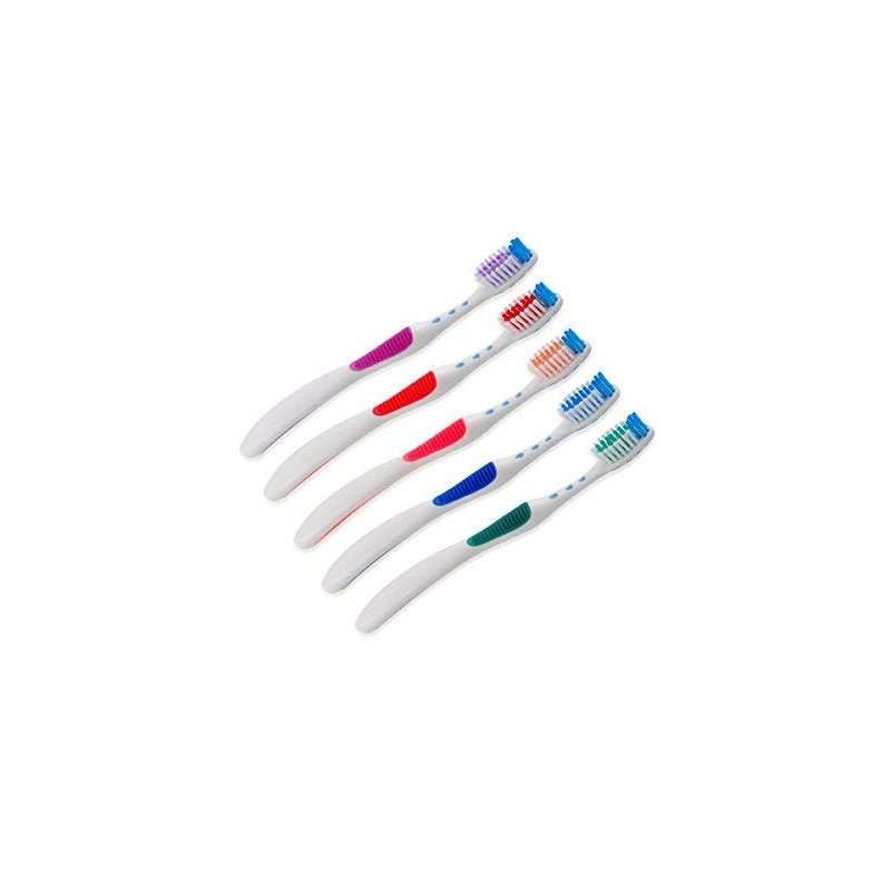 Soft bristles on a compact oval shaped head with a power tip and tongue cleaner is gentle on sensitive gums and teeth. Contoured ergonomic handle with soft rubber grips is comfortable in your hand. Five assorted colors. Suitable size for teens and adults. 12 count.