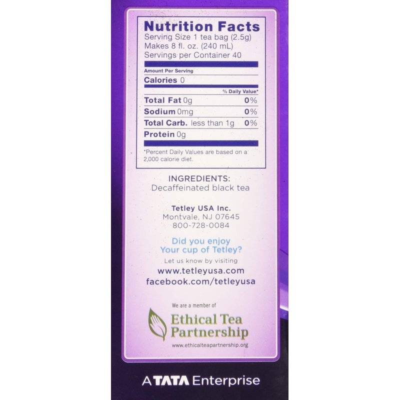 40 Round tea bags. Decaffeinated. Since 1837. Deliciously rich and robust. Celebrating the True British Cuppa: Tetley Tea proudly celebrates more than 180 years of tea expertise in crafting the perfect brew. Known for its authentic British heritage, Tetley master blenders have lovingly created our bestselling Decaffeinated British Blend from tea leaves around the world to give you a rich, bold and flavorful cup of authentic British style black tea. www.tetleyusa.com. www.ethicalteapartnership.org. Facebook. Twitter. Instagram. Follow(at)TetleyUSA. How was your Tetley tea? Questions, comments, feedback, we would love to hear from you! 800-728-0084. www.tetleyusa.com. We are a member of Ethical Tea Partnership. www.ethicalteapartnership.org.We are a member of Ethical Tea Partnership. www.ethicalteapartnership.org. Rainforest Alliance certified. people & Nature. 100% Certified Black Tea. Tetley is working with the Rainforest Alliance, a non-profit organization dedicated to sustainability and conservation around the world. We are committed to ensuring a better life for our farmers, better tea for you and a better environment for everyone. Rainforest Alliance Certified. Find out more at ra.org.