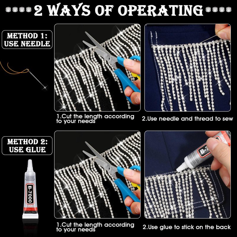 - 💎【Perfect Combination】You will receive 1 piece of 1 yards (36'') rhinestone fringe and 2 tubes of 10ml B7000 glue.The perfect combination set can easily meet your various decorating needs!