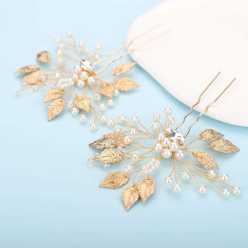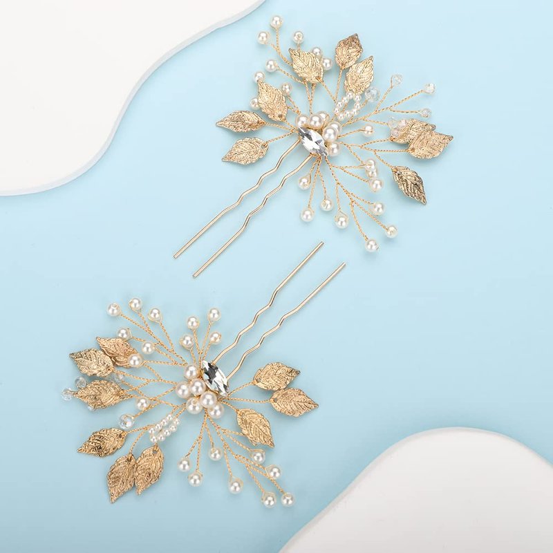 - Women Gold Leaf Peals Rhinestones Hair Pins Set