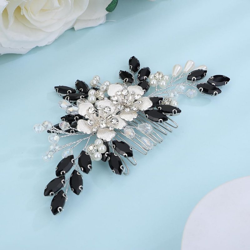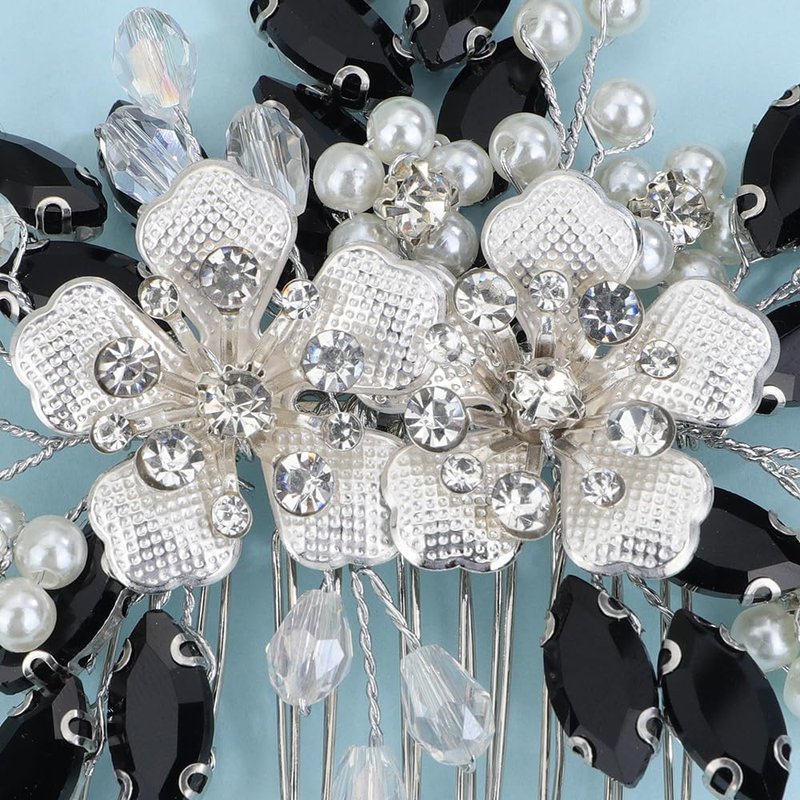 - Dainty Black Crystal Pearl Flower Hair Comb with Rhinestone.