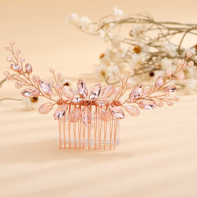 Teyglen Bridal Pink Rhinestone Crystal Hair Comb Headband Handmade Wedding Hair Pieces for Bride Floral Headpieces Hair Accessories for Women Girls (Pink)