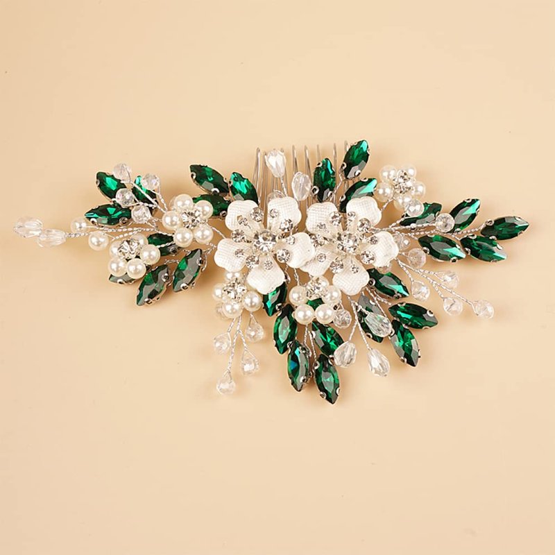 Teyglen Crystal Bride Wedding Hair Comb Vintage Green Flower Rhinestones Side Comb Shiny Hair Pieces Headpieces with Pearl Bridal Hair Accessories for Women Bride Girl(Green)
