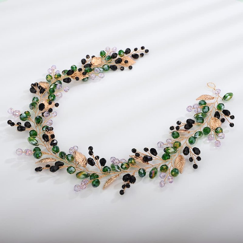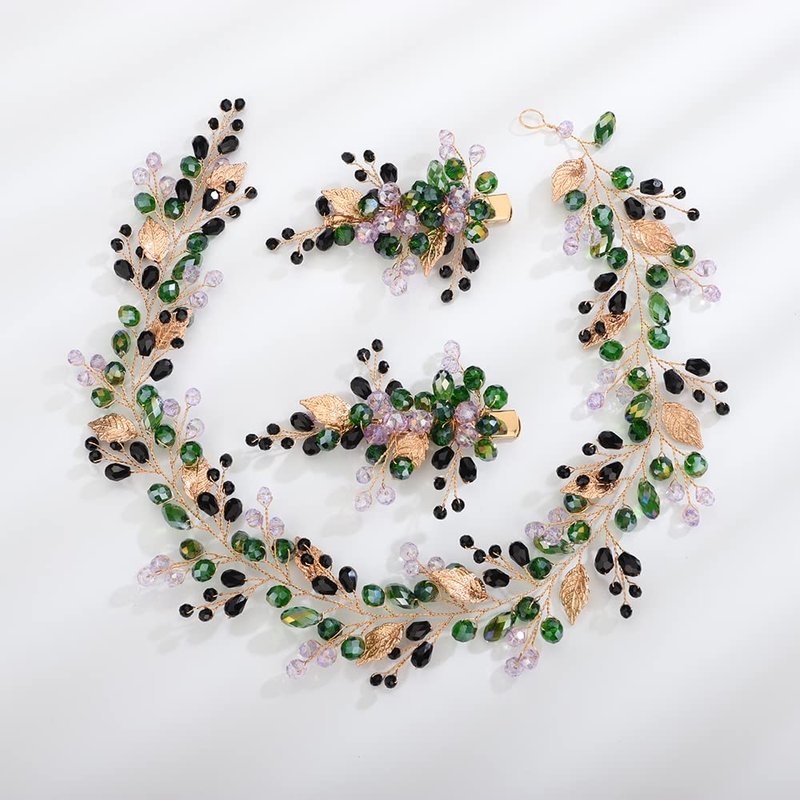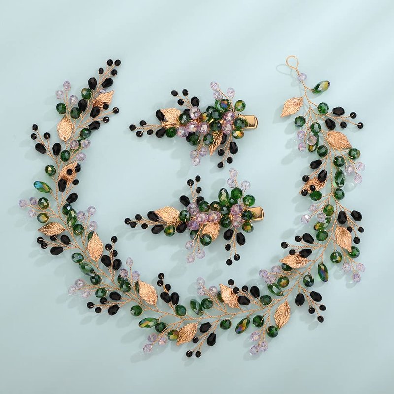 - Dainty Gold Leaf Crystal Beads Hair Vine Headband and Hair Clips Set