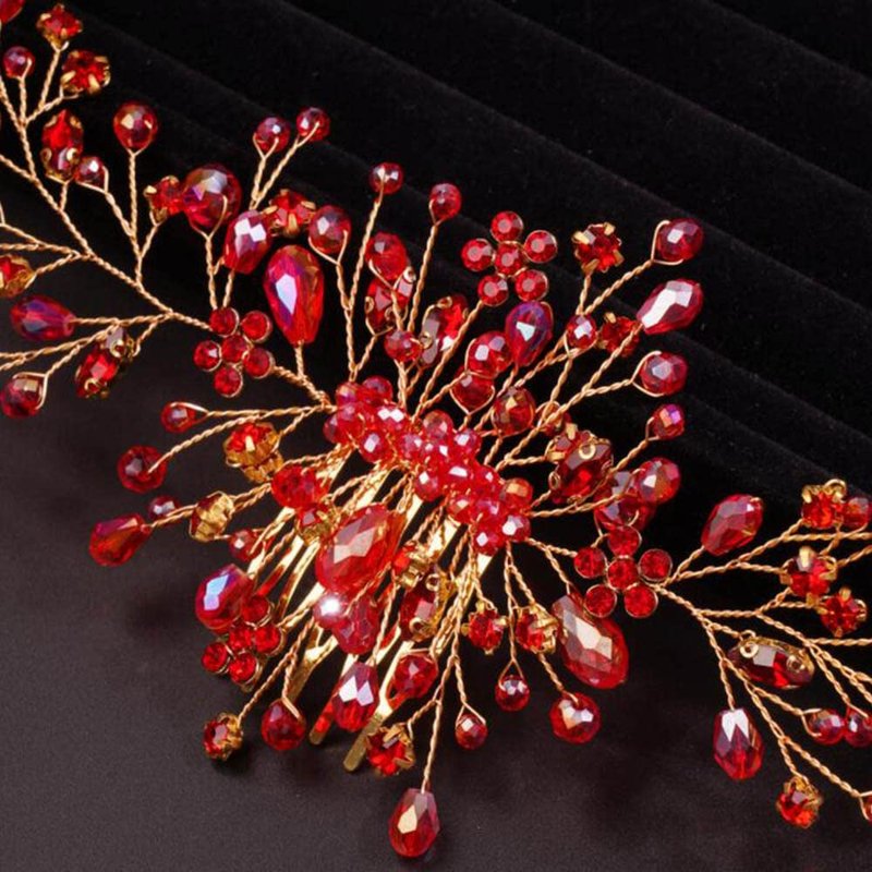 Teyglen Dainty Red Rhinestones Flower Crystal Bride Wedding Hair Comb Headband Hair Accessories with Rhinestones Crystals Bridal Side Hair Combs for Women Bride Girls (Red)