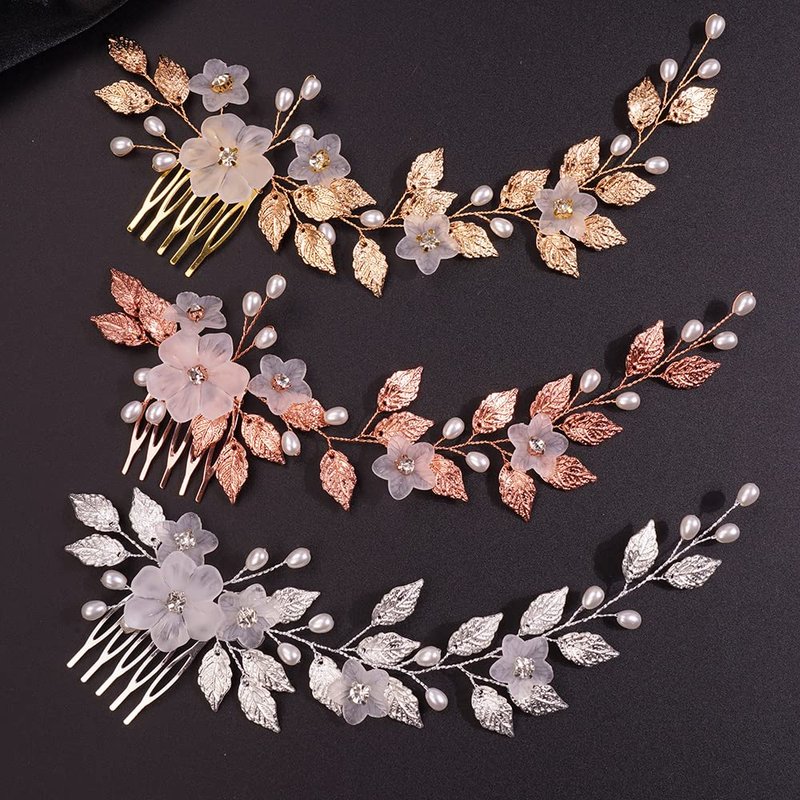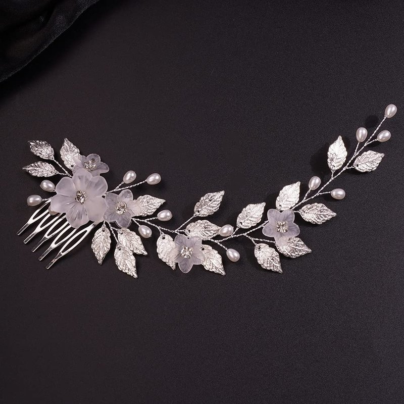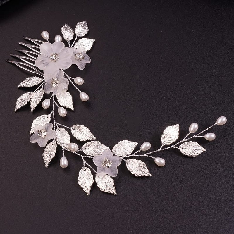 Teyglen Flower Bride Wedding Hair Comb Bridal Silver Leaf Pearl Side Hair Comb Handmade Gold Silver Leaf Rhinestone Hair Pieces Hair Accessories for Women Flower Girls Bridesmaid (Silver)