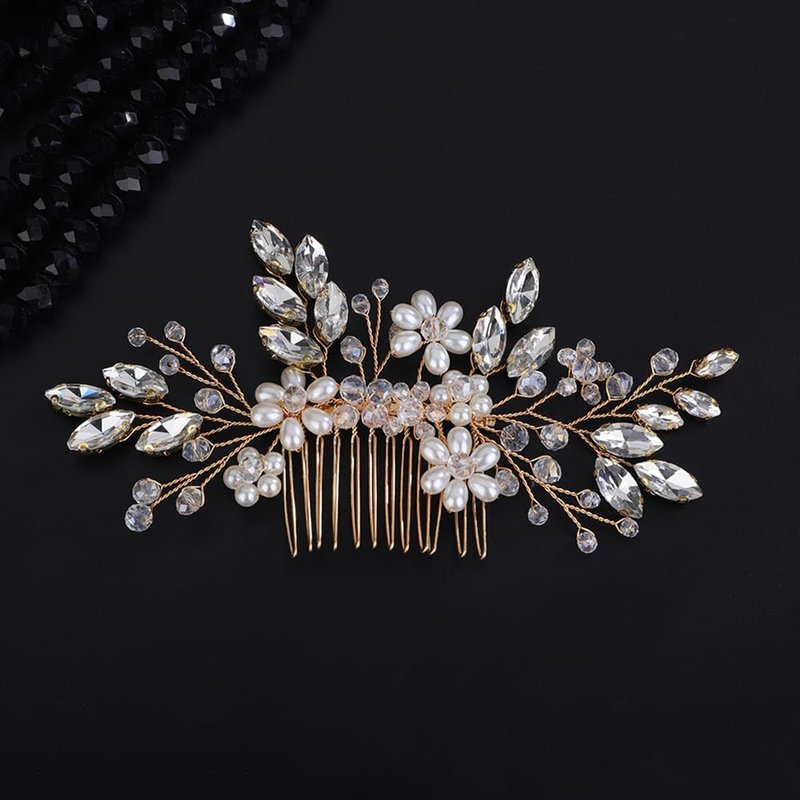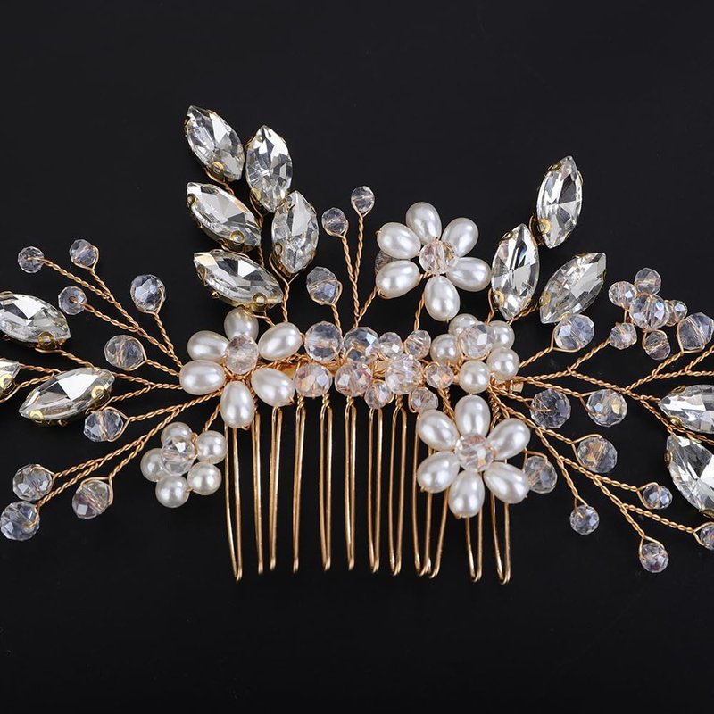 - Delicate gold crystal rhinestone hair comb with pearl flower for women party prom wedding and evening,exquisite and unique design,will add more charm for your outfit.
