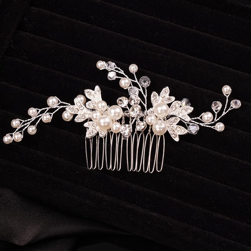 Teyglen Silver Leaf Wedding Hair Comb Bridal Crystal Pearl Hair Pieces Bridal Hair Side Comb for Bride Rhinestone Headpieces Hair Accessories for Women Girls (Silver)