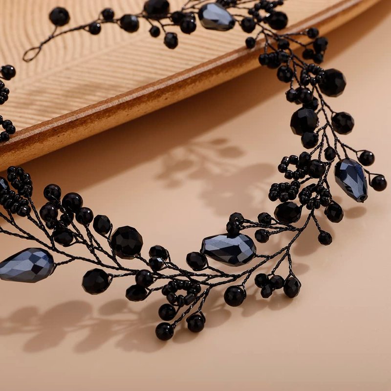 Teyglen Wedding Bride Rhinestones Crystal Headband Hair Vine Handmade Bridal Black Crystal Beads Headband Wedding Hair Accessories for Brides Hair Pieces Headpieces for Women Girl (Black)