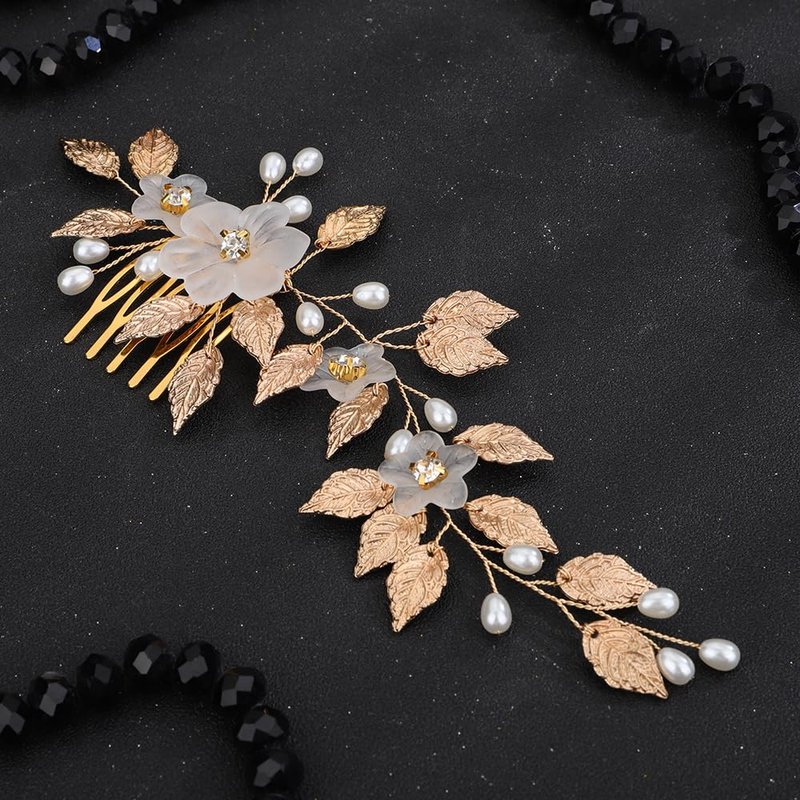 - Dainty Gold Leaf Flower Pearl Hair Comb With Rhinestone.