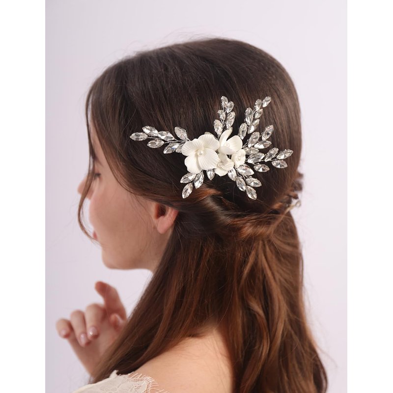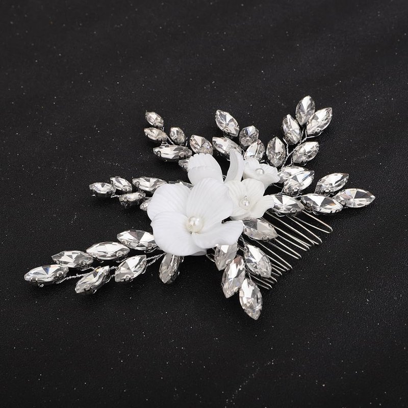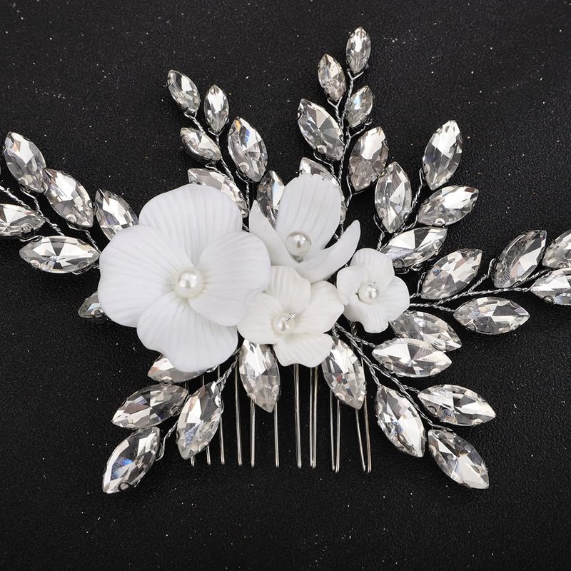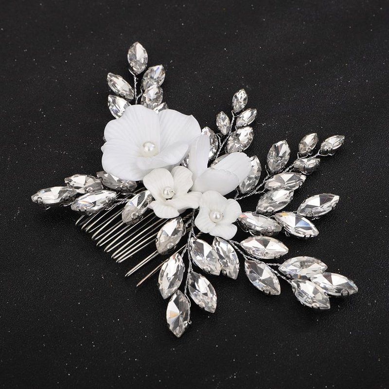 Teyglen White Flower Wedding Hair Comb Sparkly Silver Rhinestone Hair Piece Crystal Bridal Side Comb with Flower Floral Hair Accessories for Women(Silver)