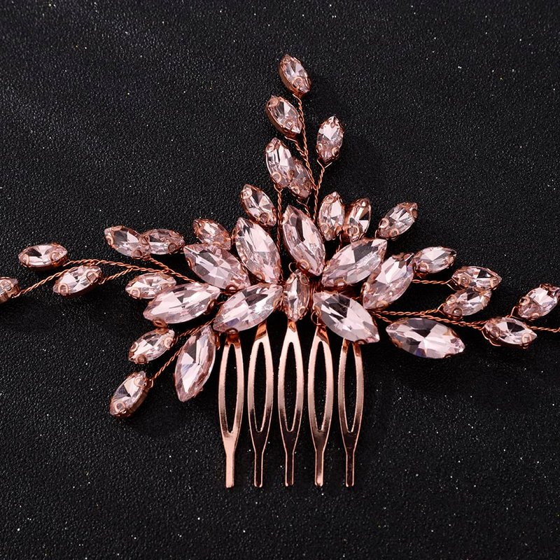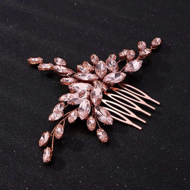 Teyglen Women Dainty Simple Full Rhinestones Red Blue Black Bride Wedding Hair Comb Luxurious Hair Accessories Shiny Rhinestones Bridal Side Hair Combs for Women Bride Girls (Rose gold-pink)