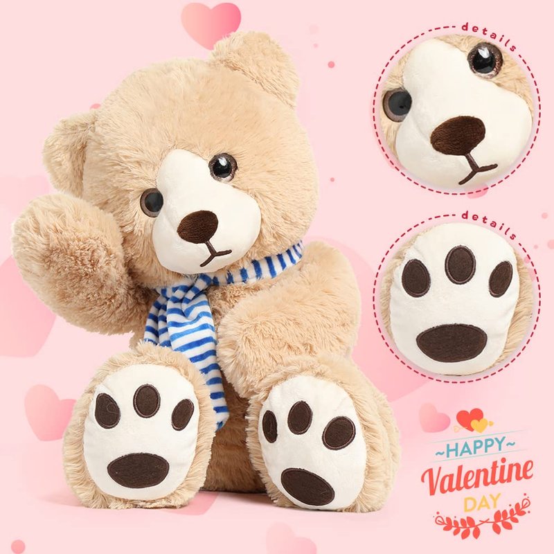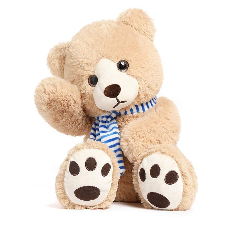 - 【Classic Teddy Bear】Our cute tan plush teddy bear stuffed animal with premium smooth fur, hand-stitched nose, blue stripes scarf, and 4 brown plum-like footprints. So classic and lifelike.