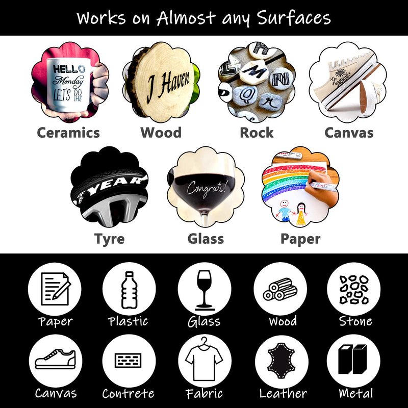 -These paint pens will write on the following surfaces glass, paper, cardboard, fabric, rubber, plastic, canvas, metal, aluminium, brass, cars, wood, stone, crafts etc.
